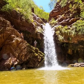 Finalmente, llegamos al Cañón de los Loros, donde iniciaremos el descenso entre imponentes paredones cubiertos de vegetación. Tras caminar unos minutos por el cauce del río, llegamos a un desfiladero desde donde cae el agua, continuando su curso hasta unirse con el río Grande kilómetros más abajo.